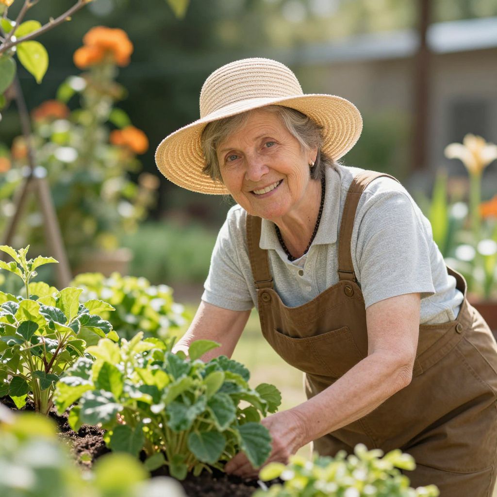 Smiling elderly woman wearing a wide-brimmed straw hat and brown overalls tends to vibrant green plants in a sunlit garden, surrounded by blurred foliage and orange blossoms in the background.