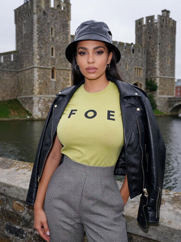 Photograph of a young woman with medium brown skin and long black hair, wearing a black bucket hat, yellow "FOE" t-shirt, black leather jacket, and high-waisted, gray-and-white houndstooth patterned pants. She stands confidently in front of a medieval stone castle with tall towers and a waterway in the background. The castle has a weathered, textured gray stone appearance. The woman's makeup is subtle, with defined eyebrows and nude lips. The image is framed with gray borders, and the overall style is modern and urban.