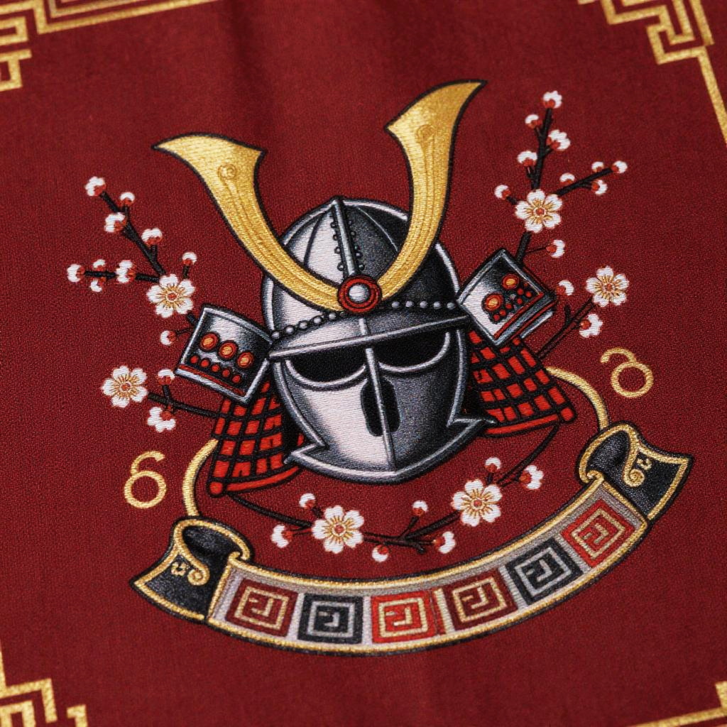 Asian family crest adorned with samurai helmet and plum blossoms, ornate geometric borders, rich crimson and ebony palette, rendered in exquisite detail on silk fabric texture.