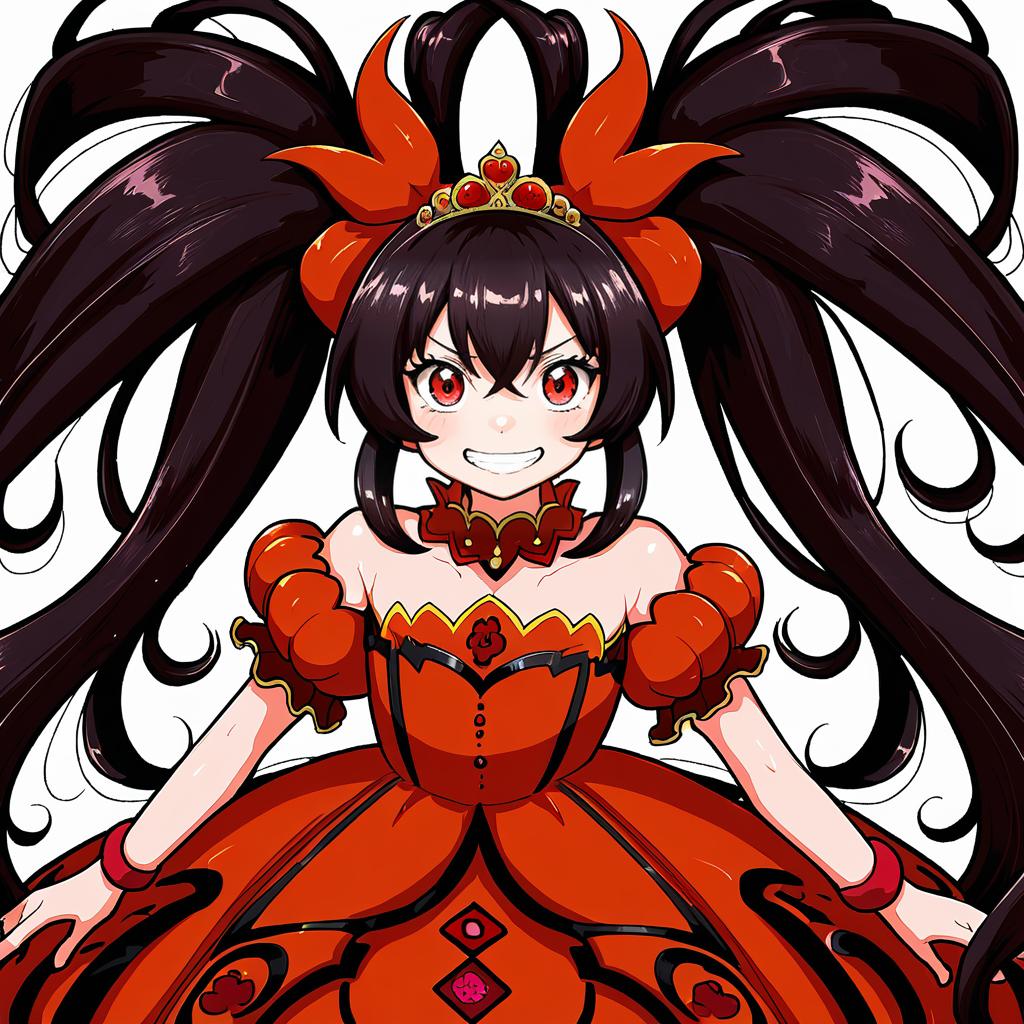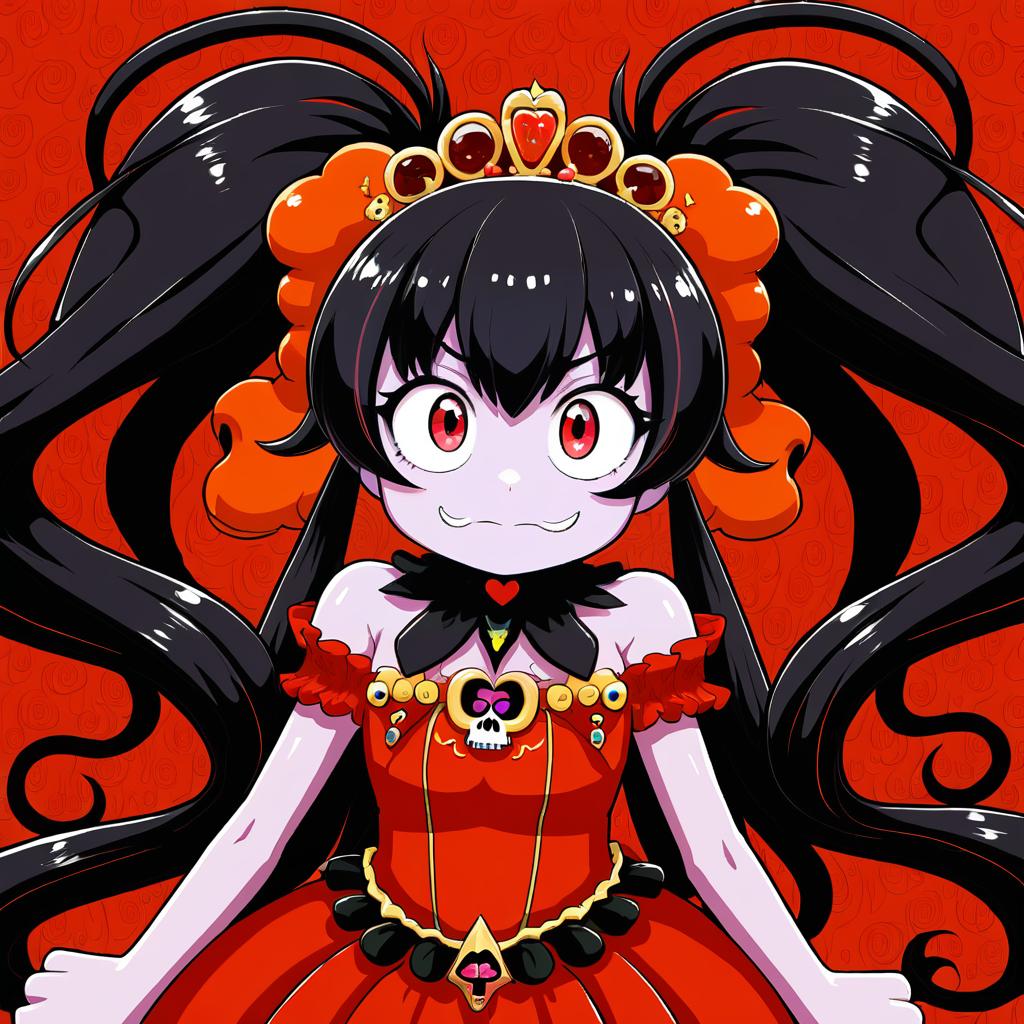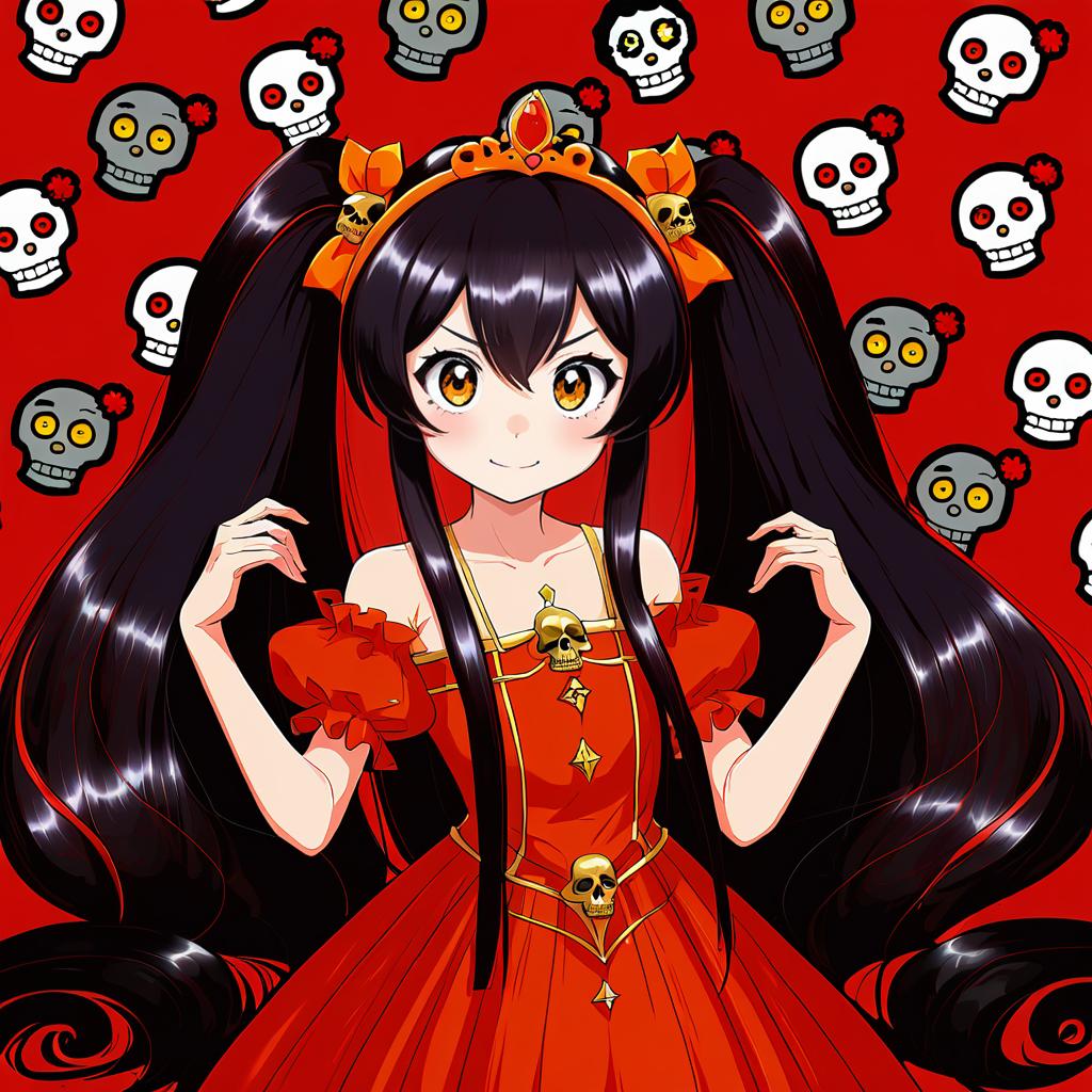 Ashley (warioware), warioware, 1girl, red eyes, black hair, long hair, very long hair, big hair, orange hairband, twintails, red dress, tiara, skull, by artist rindou (p41neko), anime