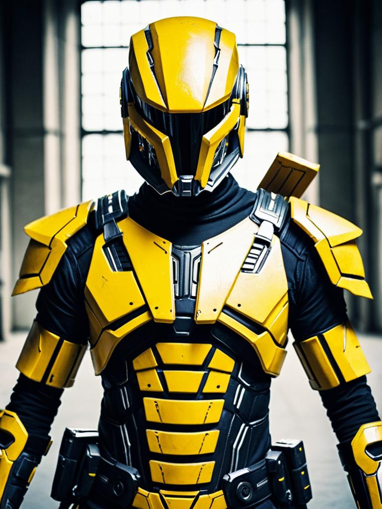 A man wearing a detailed, realistic Cyrax cosplay costume featuring black and yellow armor with futuristic design elements. The costume includes a helmet with green glowing eyes, segmented chest and arm armor, and a belt with a circular buckle. The overall look is inspired by the Cyrax character from the Mortal Kombat video game series.