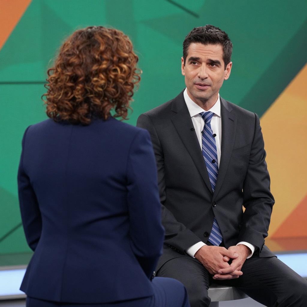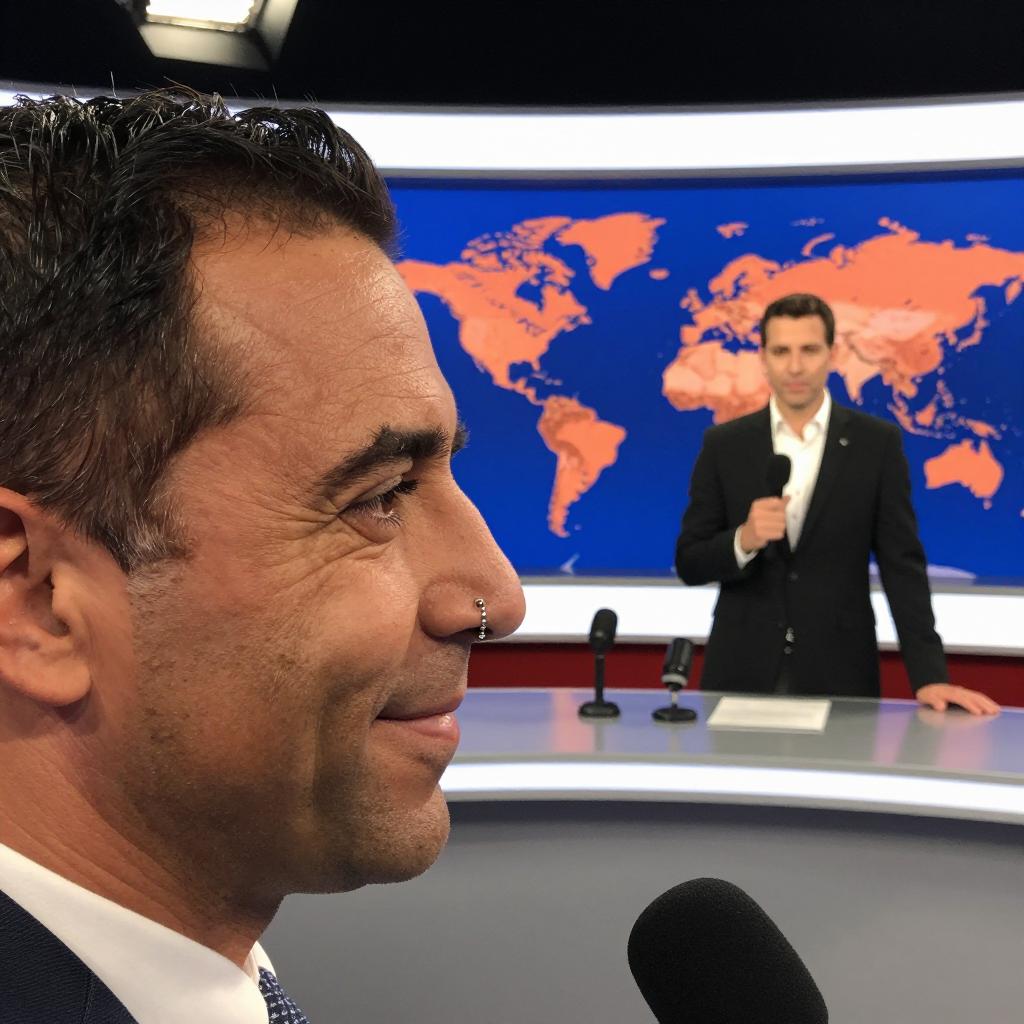 A news studio. Close-up of a man's profile in the foreground, smiling with a nose ring. In the background, another man in a black suit and white shirt stands behind a news desk, holding a microphone. World map with orange continents on a blue background is behind the news desk. Two black microphones on the desk. Dimly lit studio with visible lighting equipment.