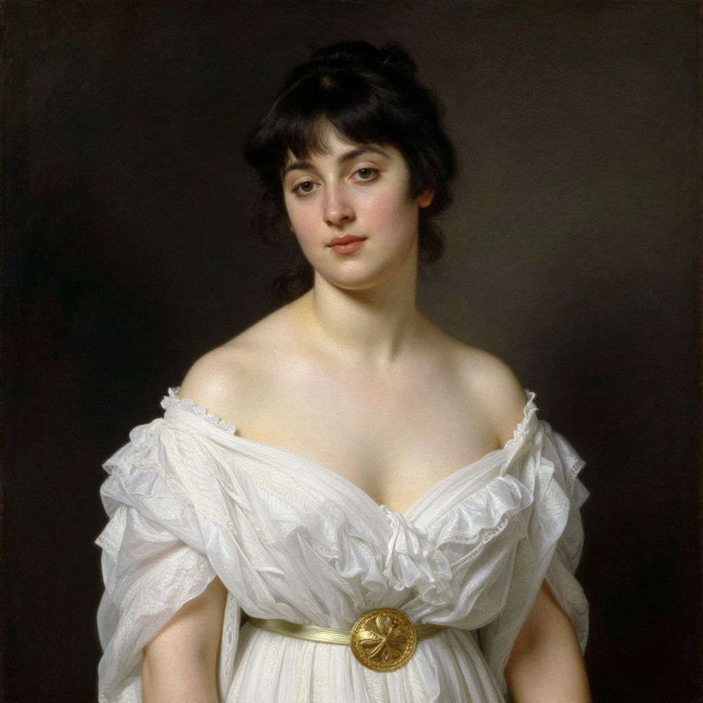 William Adolphe Bouguereau's portrait painting depicts a young woman with dark, styled hair, wearing an off-the-shoulder white dress with ruffled detailing and a gold medallion belt, set against a dark background that highlights her serene expression and elegant attire.