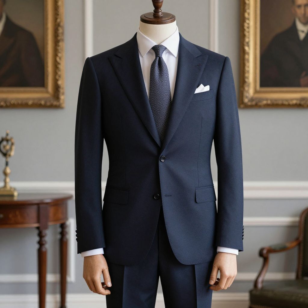 Photograph of a mannequin wearing a dark navy blue tailored suit with a white dress shirt and a black polka-dot tie. A white pocket square is neatly tucked into the suit's breast pocket. The mannequin is headless, with a wooden neck stand. The background features a classic, elegant room with light gray walls, white wainscoting, and two framed portraits of men in dark suits on the wall. A wooden console table with a decorative ornament and a dark wooden armchair are visible on the left and right sides, respectively. The lighting is natural, highlighting the suit's crisp texture and formal style.