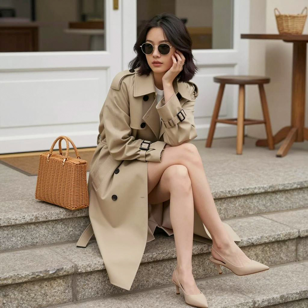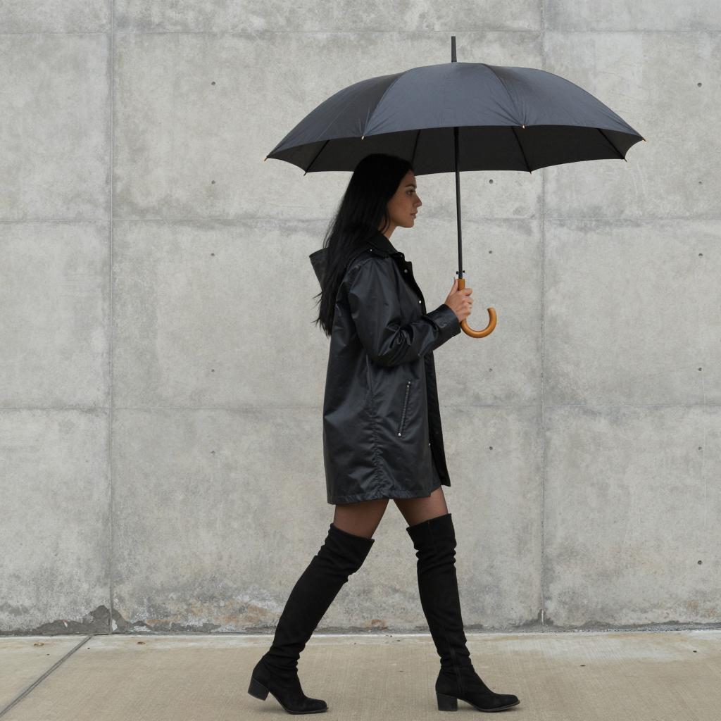 Young woman with long brown hair wearing a black long-sleeve top, black skirt, and black ankle boots holds a beige umbrella while standing in a crosswalk on a wet urban street. She carries a brown leather backpack and looks to the side amidst city buildings, cars, and pedestrians.