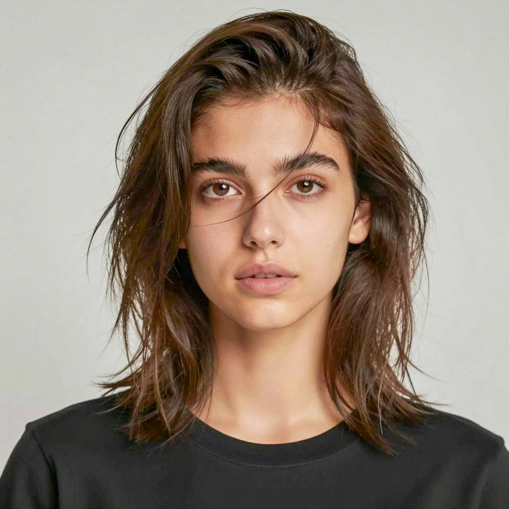Photograph of a young woman with light brown skin, dark brown eyes, and full lips. She has long, dark brown hair pulled back. She wears subtle makeup with defined eyebrows and nude lipstick. Background is a plain, light green wall. Her expression is neutral. She is centered in the frame, facing forward.
