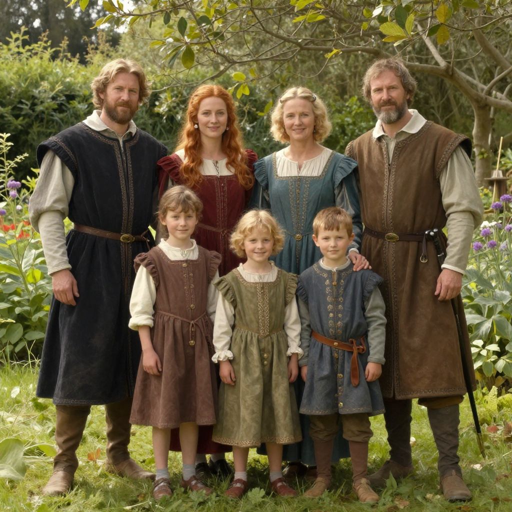 Medieval family portrait featuring a humble noble family outdoors, lush garden setting, soft diffused sunlight, period accurate clothing with embroidery, painterly brush strokes with warm palette