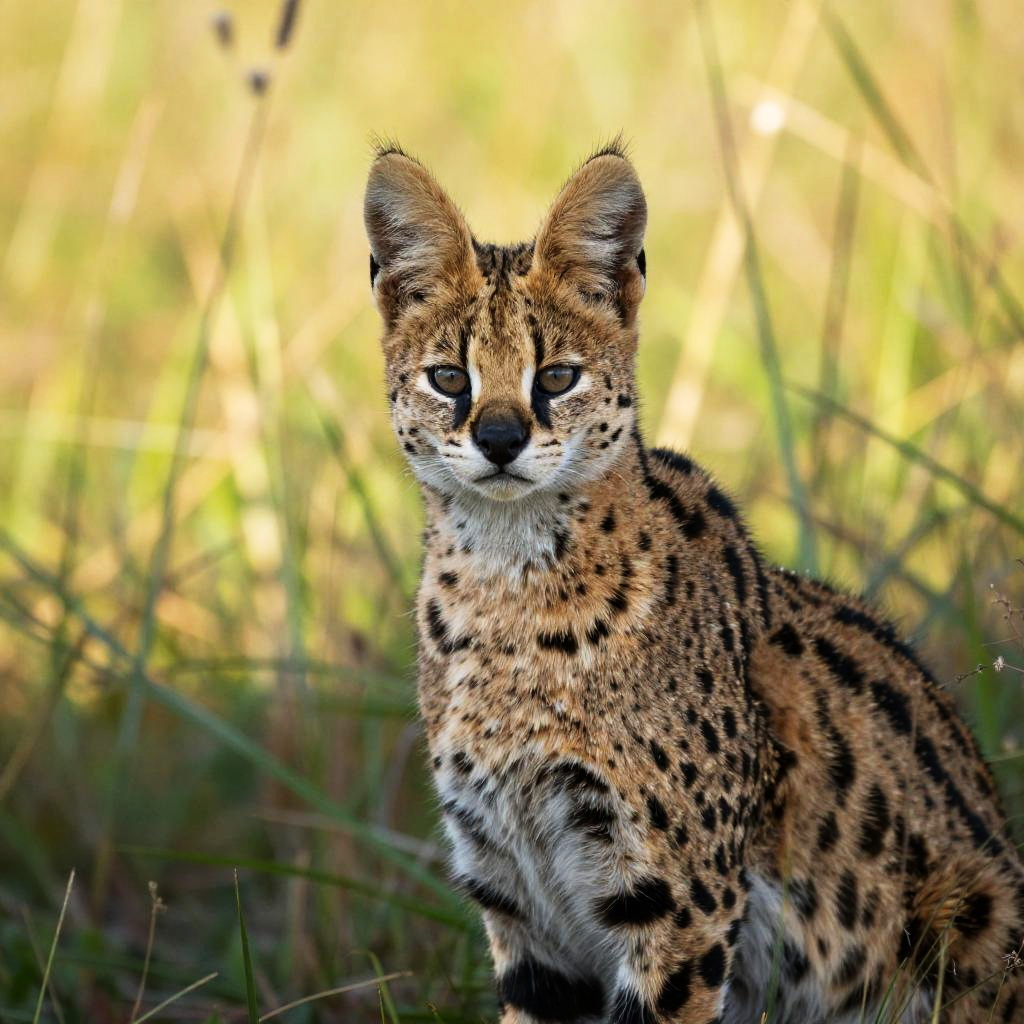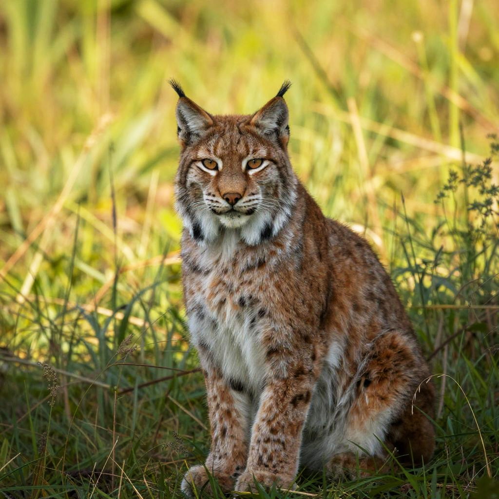 Photograph of a sleek, brown and black Cheetah with tufted ears, sitting alertly in a sunlit, grassy meadow. The background is a soft blur of green and yellow grasses, with tall stalks slightly out of focus. The Cheetah's piercing eyes and pointed ears stand out against the bright, natural setting. The image has a watermark in the middle.