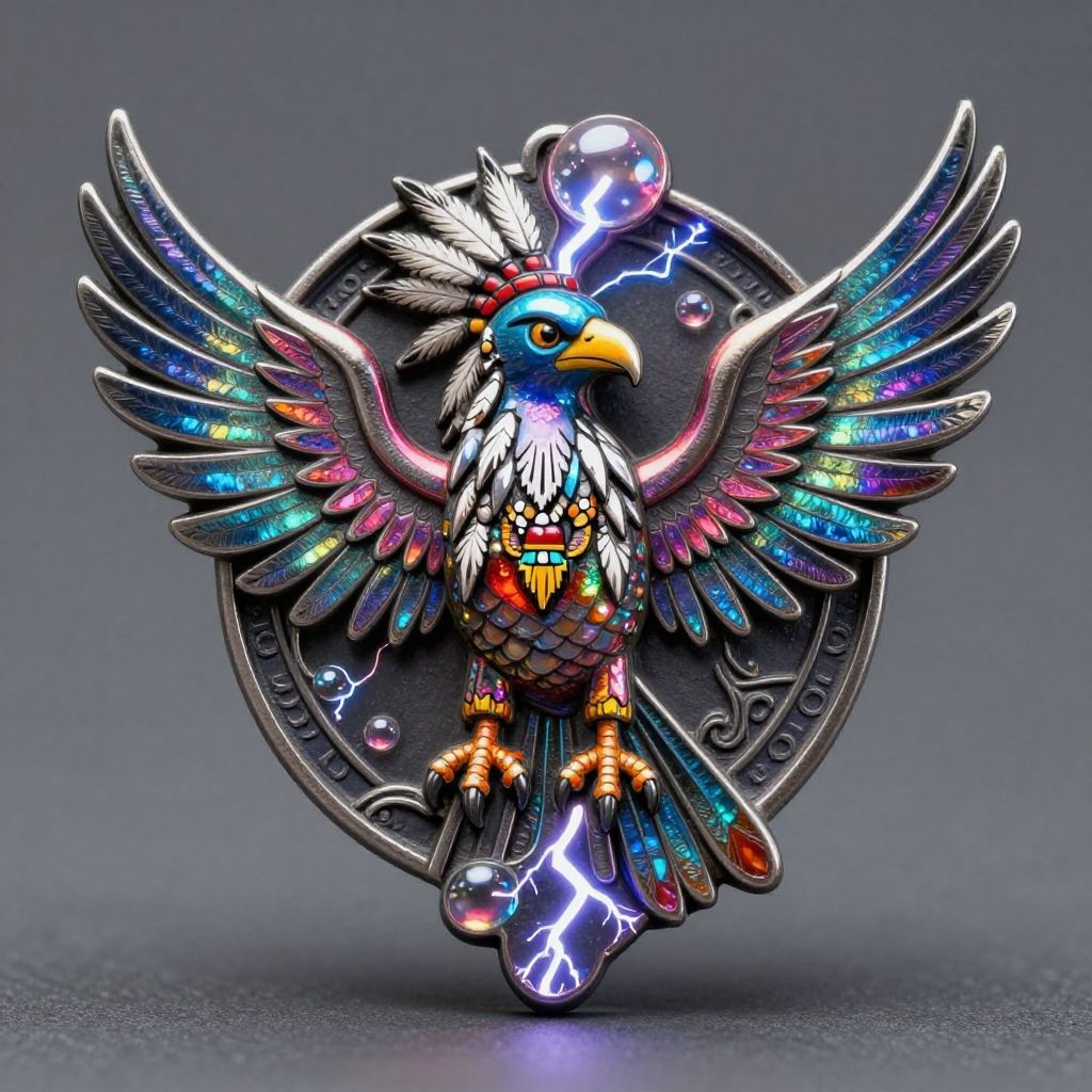 Metal trinket depicting a Thunderbird - Mythological bird from Native American folklore associated with thunderstorms and lightning. Prudence Heward, natural, shimmering, vibrant, gothic, rpg, 1400ad, ultra detailed, detailed, immersive, reminiscent of high fantasy RPG games, HD, masterpiece, best quality, hyper detailed, super realistic, perfect face, perfect hands, award-winning, professional, breathtaking, linquiverasublime Estuarysummer weatherBubble Bobble style . 8-bit, cute, pixelated, fantasy