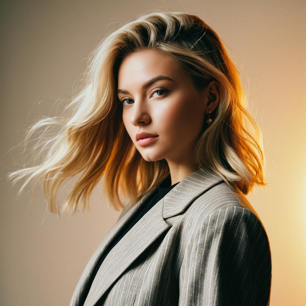 Ash Blonde hairstyle on elegant gown, wearing elegant gown, in rooftop, captured in fashion editorial style with soft tone.
