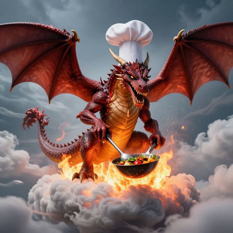 Digital artwork of a red dragon with wings, wearing a white chef hat, cooking over a fiery bowl on a cloud.