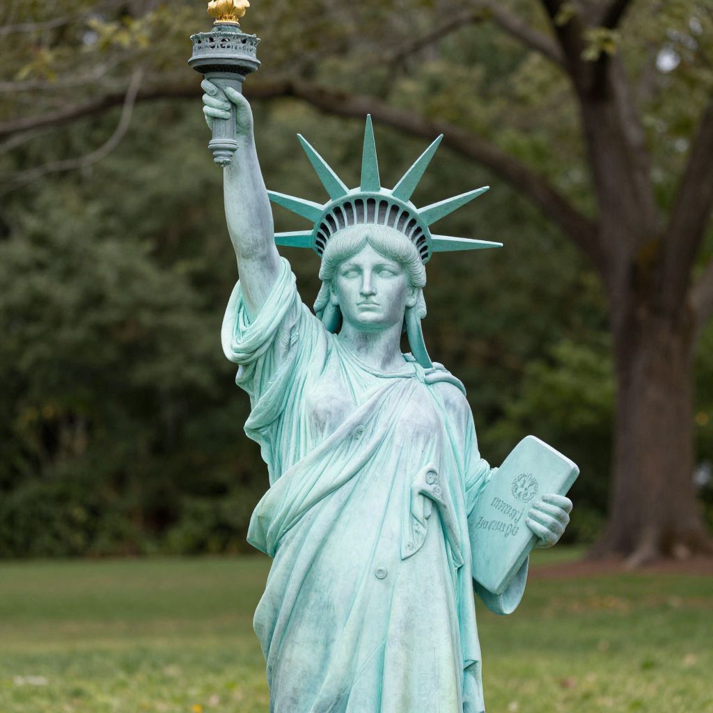 Photograph of the Statue of Liberty holding torch aloft and tablet with "JULY IV MDCCLXXVI" in a lush, green