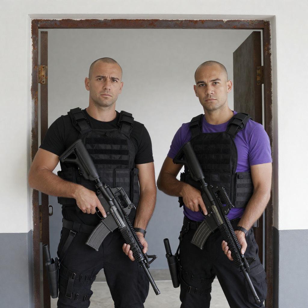Photograph of two armed men standing in a doorway. Both bald, wearing tactical vests over black and purple shirts, holding rifles. The man on the left has a stern expression, the man on the right has a neutral expression. Background includes white walls and a rusted door frame. Both men are standing close together, slightly angled to the right.