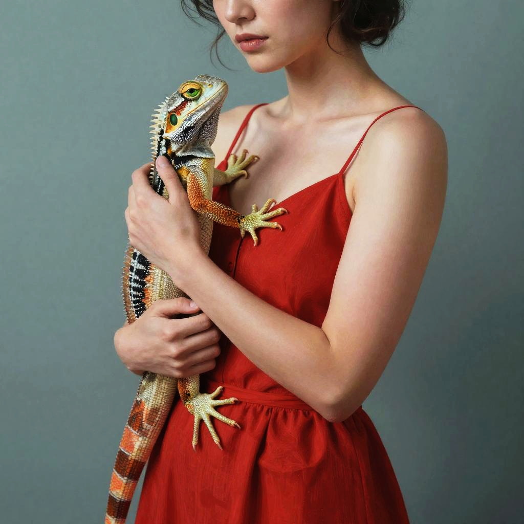 Realistic photo.Abstract illustration of a woman in a red dress holding a lizard with green eyes, vibrant colors, surreal lighting, abstract and professional quality realistic photo