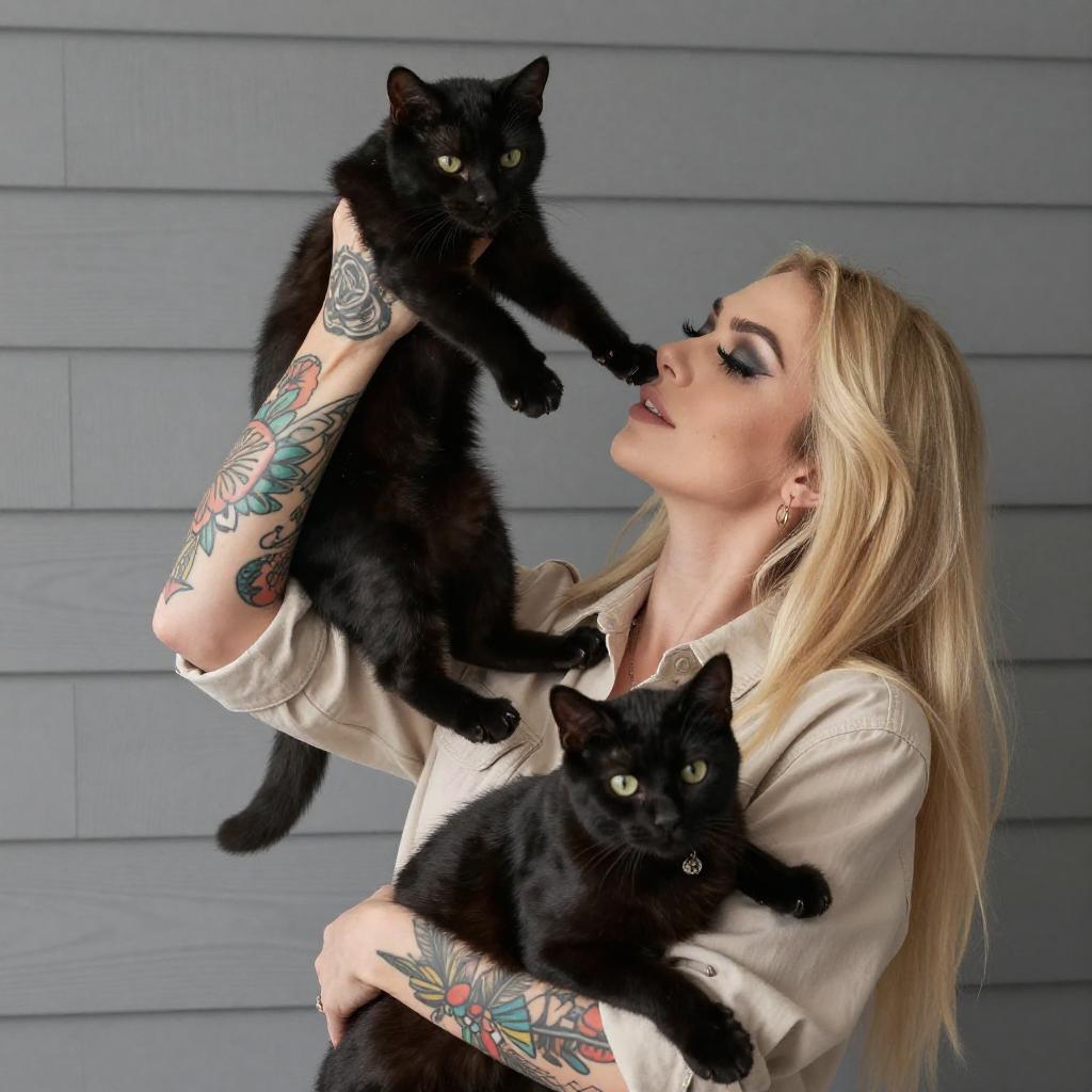 Photograph of a blonde woman with long hair, wearing a beige shirt, holding two black cats. Her right arm, heavily tattooed with colorful designs, lifts one cat above her head, while she cradles the other in her lap. She has dark eye makeup and a neutral expression. The background features gray wooden panels.