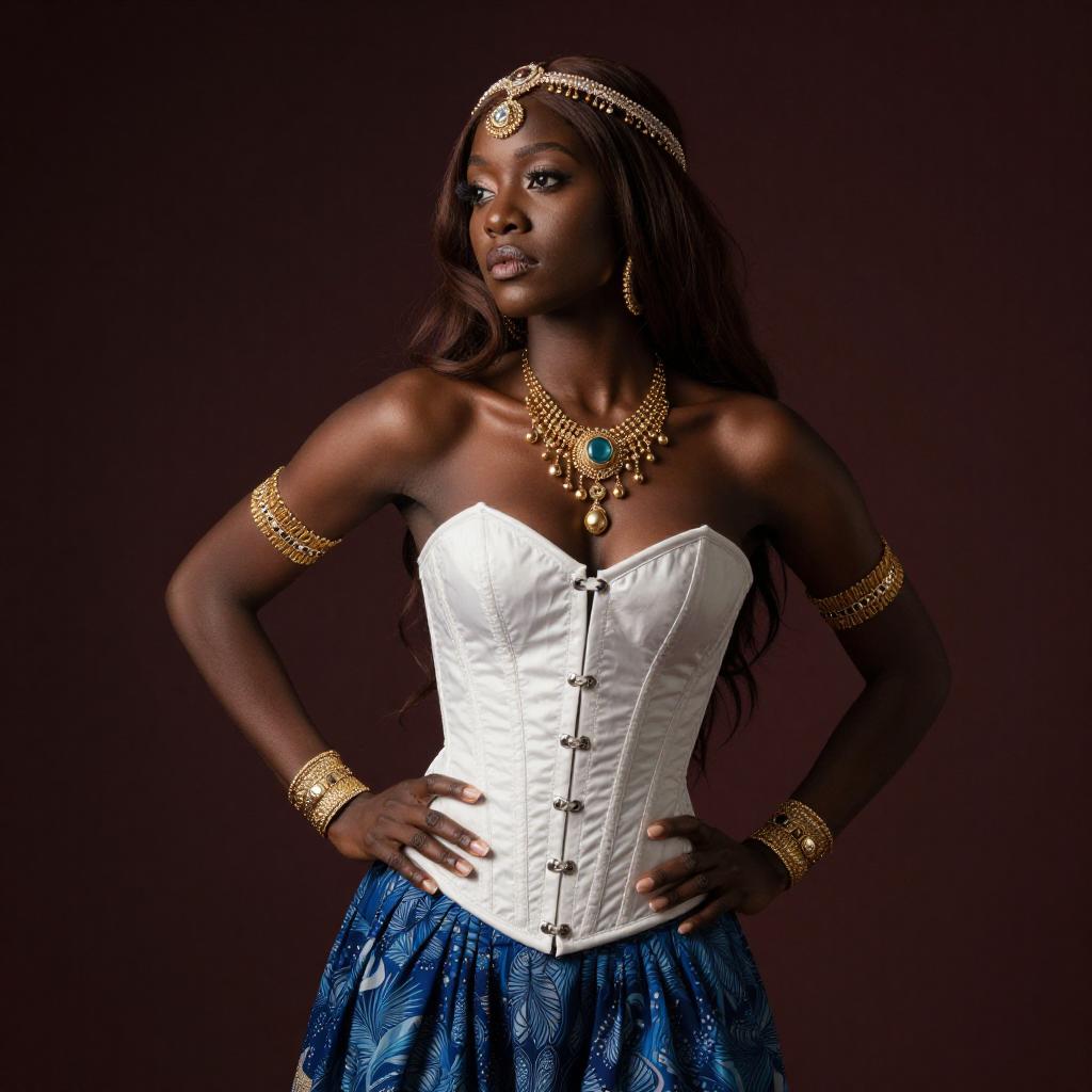 Photograph of a dark-skinned woman with long brown hair, wearing a white, low-cut corset dress with silver buttons, adorned with gold jewelry including a large necklace and arm cuffs. She stands against a dark, ured wall, illuminated by soft light, with a blue patterned skirt and intricate headpiece. Her hands rest on her waist, and she gazes to the side with a serious expression.