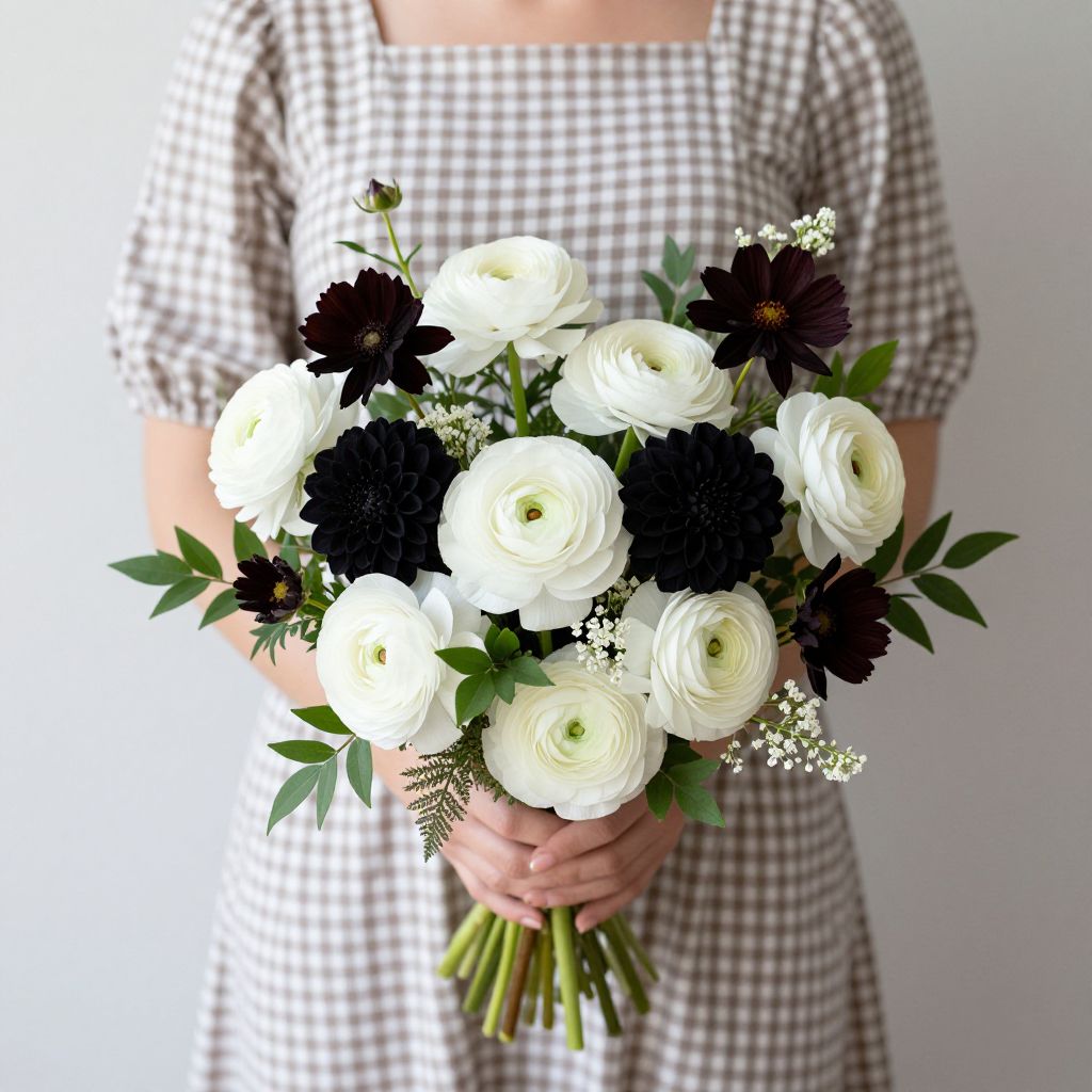 Woman in a taupe and white gingham dress holds a bouquet featuring six white ranunculus, four black dahlias, and three chocolate cosmos, complemented by green foliage and small white filler flowers.