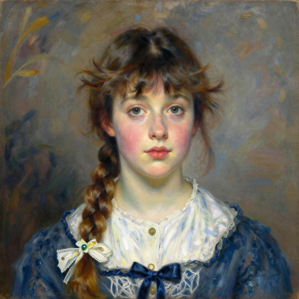 Realistic photo.A frontal vintage portrait of a charming young woman painted by Pierre-Auguste Renoir, featuring playful expressions and bright colors, highly detailed and artistic realistic photo