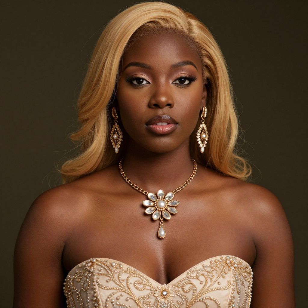 "zulu bride, 1girl, solo, jewelry, dark skin, necklace, flower, dress, dark-skinned female, earrings, blonde hair, bare shoulders, strapless"