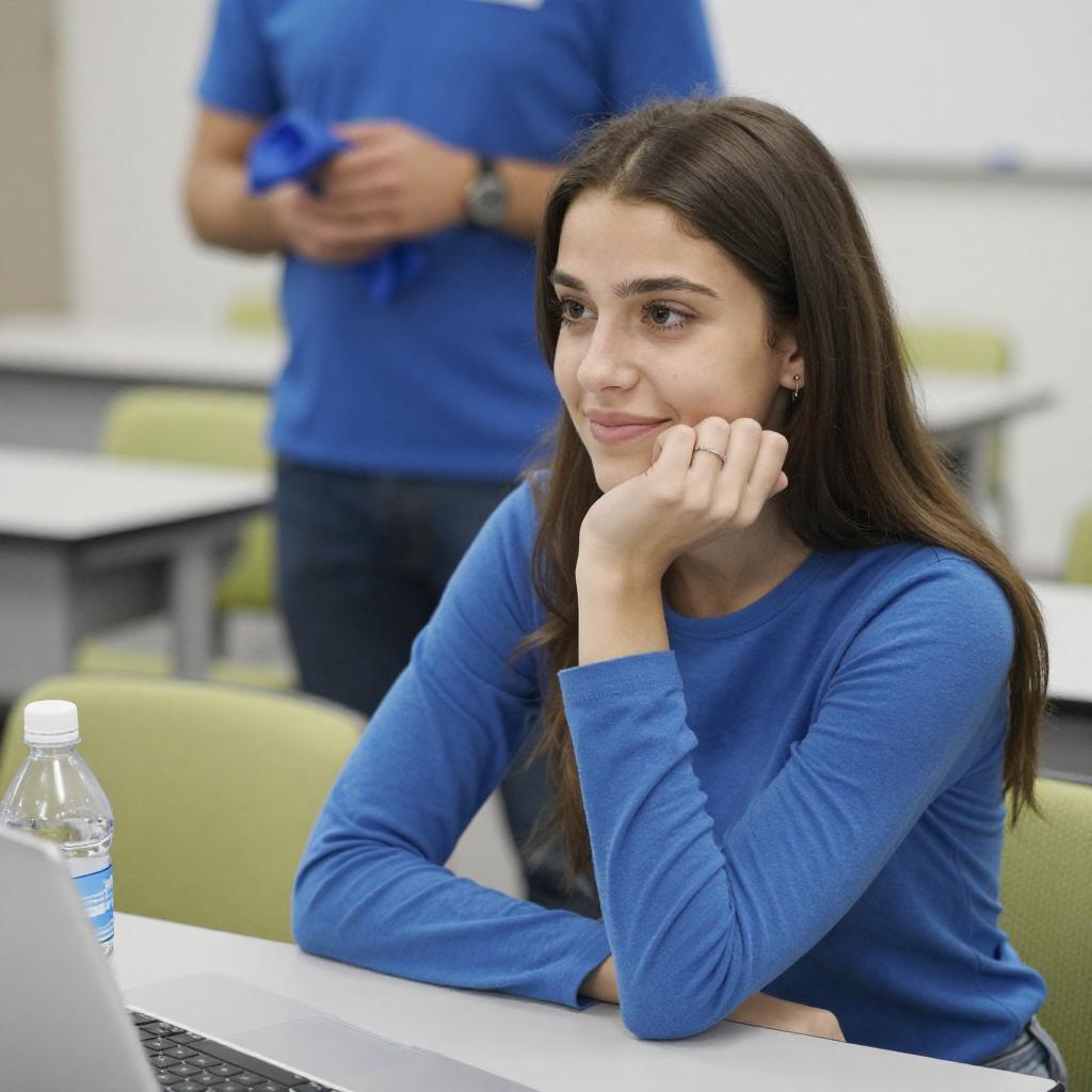 Photograph of a young woman with long, straight brown hair, wearing a blue long-sleeve shirt, sitting at a white desk, resting her chin on her hand, smiling slightly. A blue-clothed man stands in the blurred background. A green chair and a plastic water bottle are on the desk.