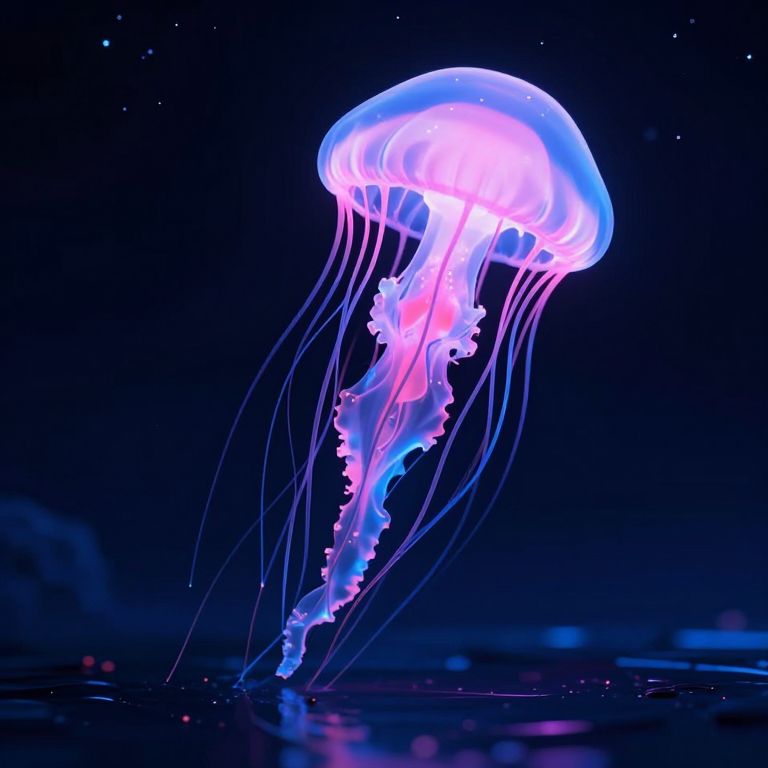 A mesmerizing 3D-rendered jellyfish, bathed in vibrant neon hues of pink and blue, floats serenely above a dark, reflective surface, its translucent tentacles cascading like liquid light against a star-studded night sky, evoking a cyberpunk fantasy aesthetic.