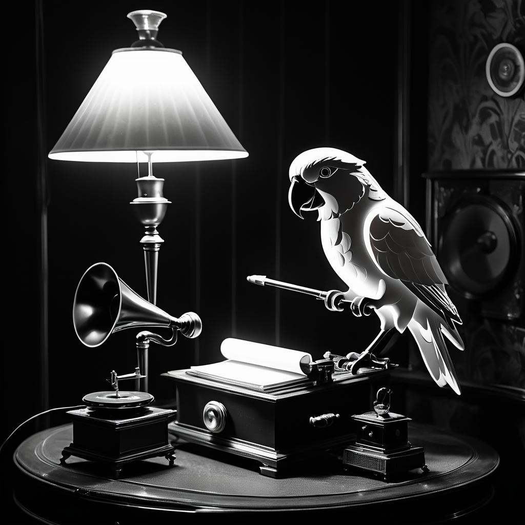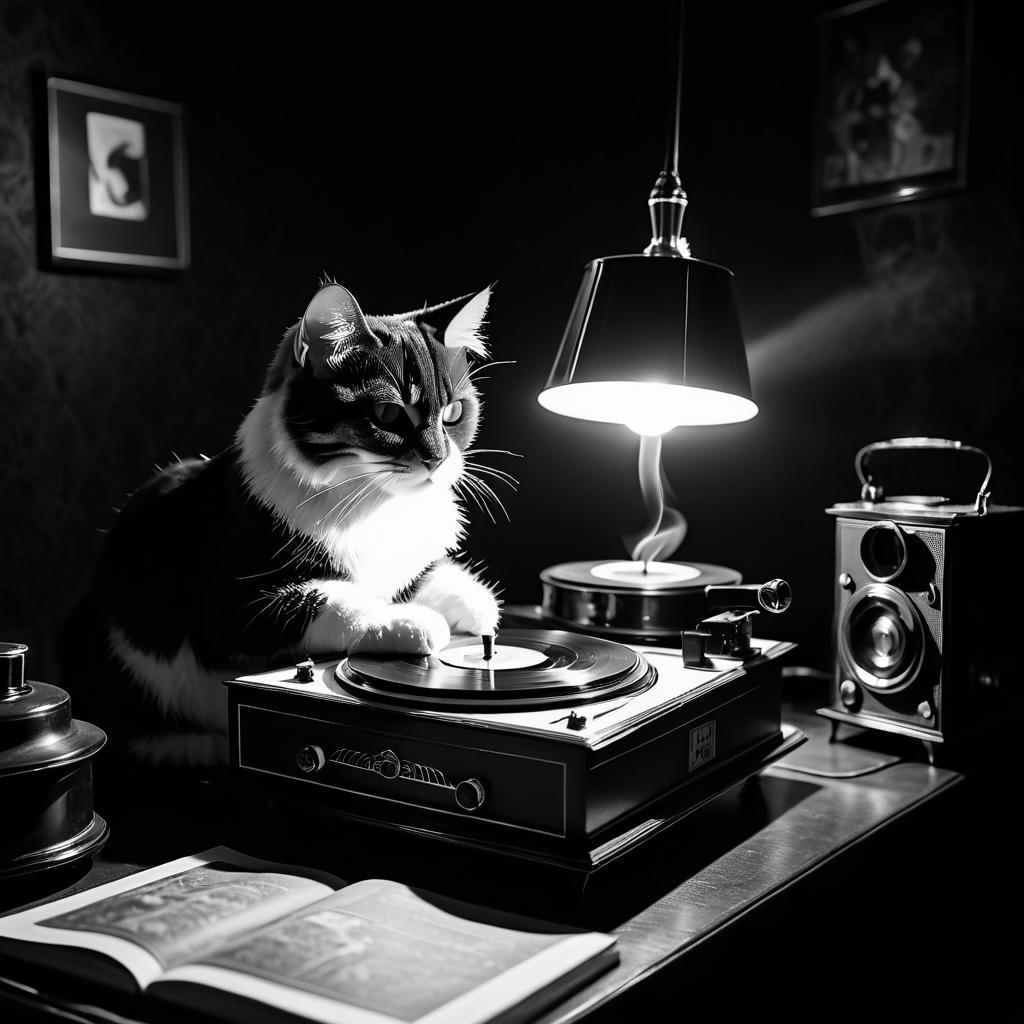 Black and white photo of a tuxedo cat sitting beside a vintage record player on a dark wooden table in a 1920s-style noir room. The scene is softly illuminated by a table lamp and a hanging lamp, highlighting details such as the record player, books, and framed artwork on the walls. The room features a nostalgic vintage ambiance with film grain texture, evoking a classic noir atmosphere.