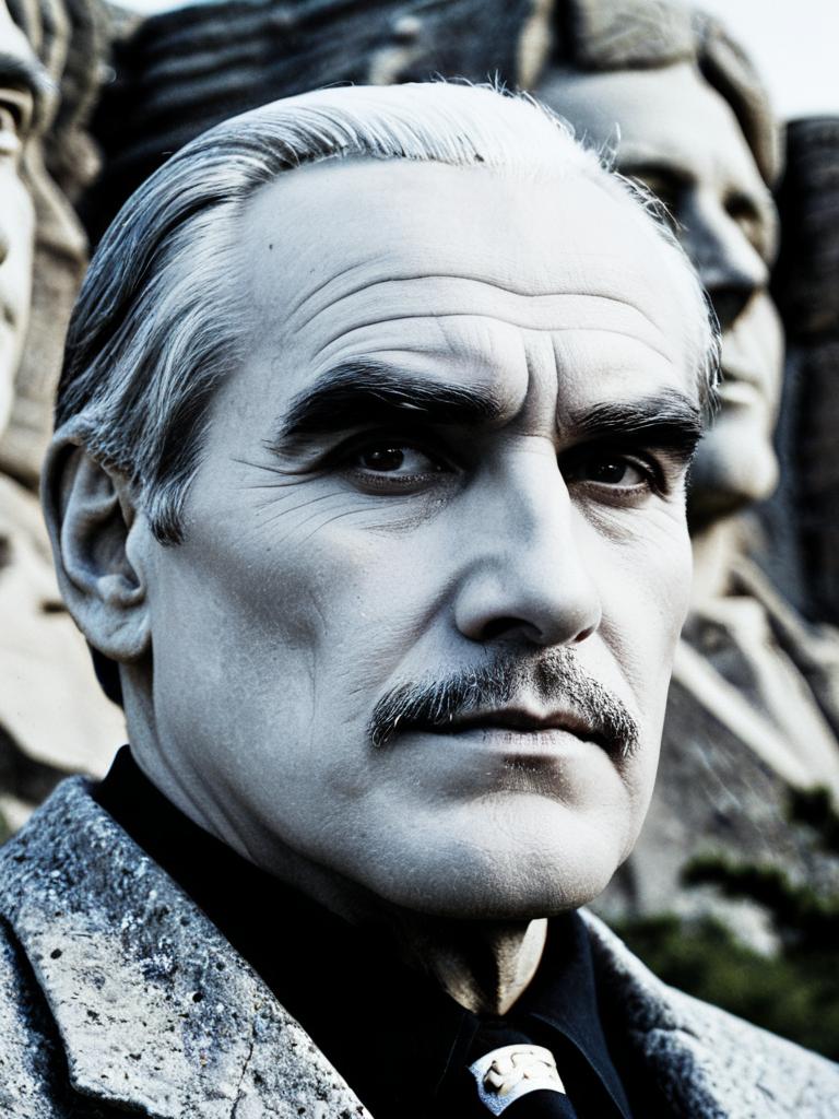 Man in Mount Rushmore costume, photorealistic close-up headshot with rock-like makeup