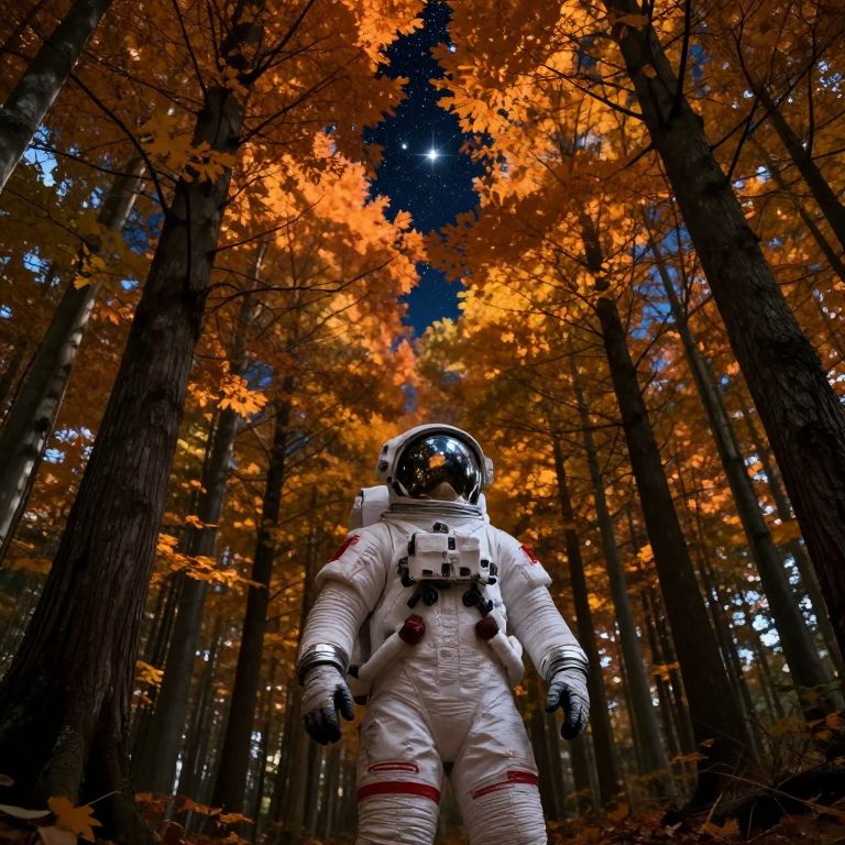 A mesmerizing digital artwork blends realism with fantasy, depicting an astronaut alone in a dense forest bathed in the warm hues of autumn. The astronaut, clad in a weathered yet intricately detailed spacesuit, gazes upward at twinkling celestial bodies peeking through the canopy. Each leaf on the towering trees is showcased in sharp detail against the starlit night sky, evoking an emotional spectrum from awe to introspection. Captured from a low-angle perspective, this scene underscores the grandeur and majesty of nature as it intertwines with the vastness of space, creating a captivating narrative that lingers in the imagination.