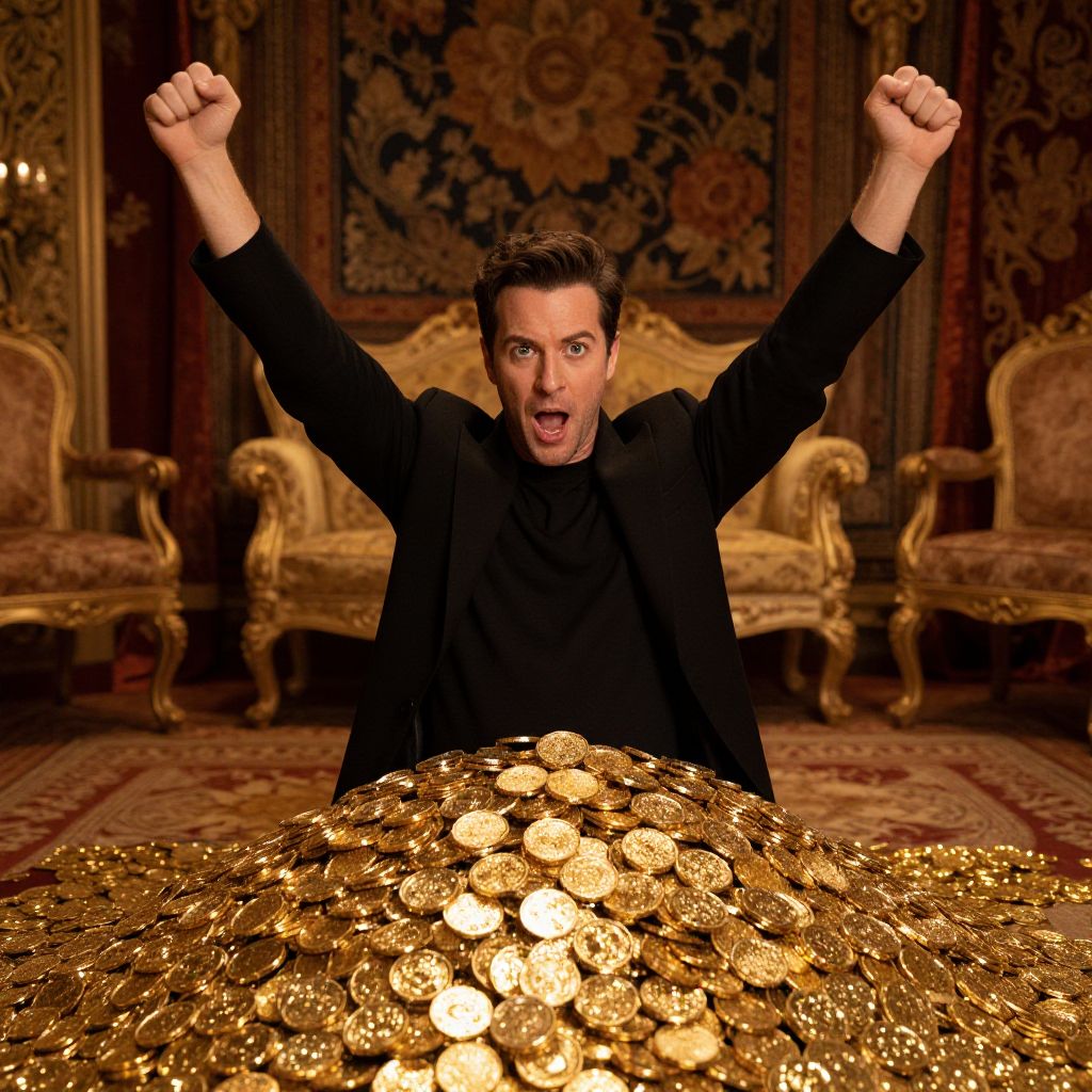 Photograph of a shocked young man with short brown hair, wearing a black suit, standing behind a massive pile of shimmering gold coins. His arms are raised triumphantly, and his mouth is open in a wide expression of surprise. The background features ornate, dark brown and gold patterned wallpaper and luxurious, gold-upholstered chairs. The floor is covered with a rich, red-patterned carpet. The gold coins in the foreground reflect light, adding a glittering effect to the image. The overall setting is opulent and dramatic.