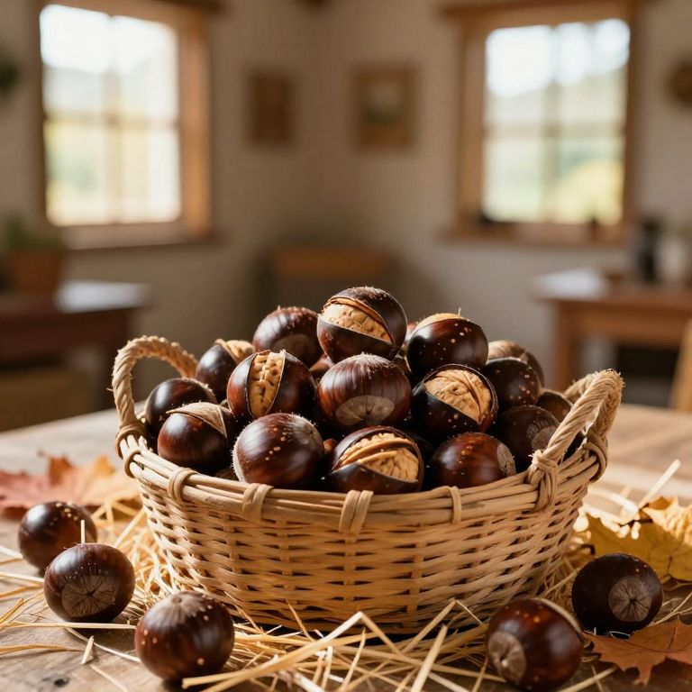 Photograph of a wicker basket filled with dark, glossy chestnuts, placed on a wooden table with straw and autumn leaves, in a warmly lit