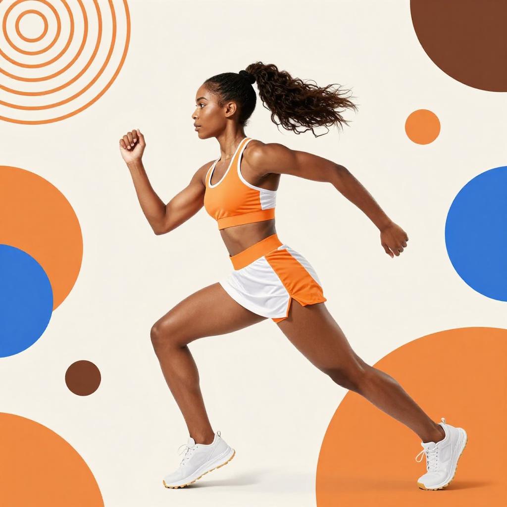 Digital art of an African American woman with dark skin and athletic build in mid-action running pose. She wears an orange and white sports bra and matching skirt, paired with white running shoes. The background features a radiant design with abstract geometric patterns in orange, blue, and brown, emphasizing energy and movement.