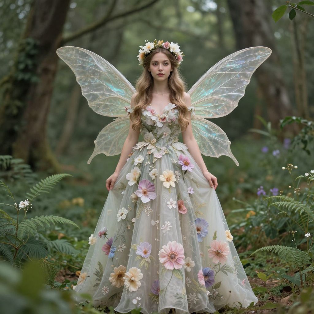A whimsical fairy stands elegantly in a lush, ethereal forest, adorned in a stunning floral gown that blends seamlessly with her enchanting surroundings. Her delicate wings and floral crown enhance her magical presence, making this image a captivating representation of fantasy and beauty.