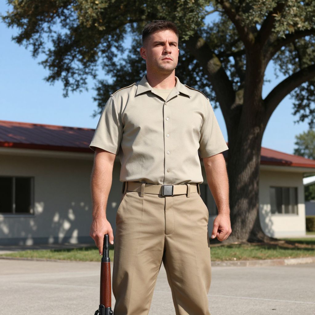 A man in a military uniform is standing in front of a building with a tree in the background. He has a strong, athletic build, and his face is stern with a determined expression. The building is a modern structure with a red roof, and the tree is a tall, leafy oak. The scene is set in a sunny afternoon with clear blue skies. The man's uniform is well-fitted, with a neatly pressed shirt and khaki pants, and he is holding a rifle at his side, exuding authority and readiness.