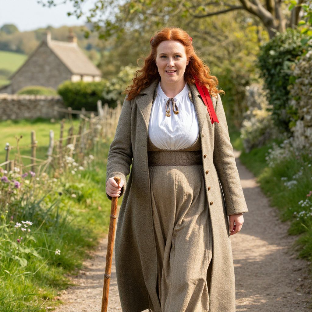 A high-resolution photo of a woman with curly red hair and a friendly, kind expression, wearing a full Anne Avonlea costume complete with a woolen coat, a red ribbon in her hair, and a wooden walking stick, walking through a sun-dappled countryside path surrounded by wildflowers and a stone cottage in the distance.. The woman has big tits and cute face