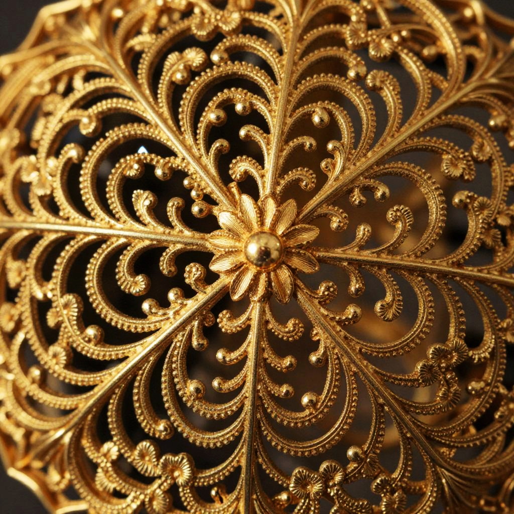 Filigree delicate golden jewelry intricately crafted with swirling elegant patterns, shining softly under warm light, detailed lace-like metalwork with floral and vine motifs, vintage style, high detail, macro shot emphasizing fine craftsmanship and texture