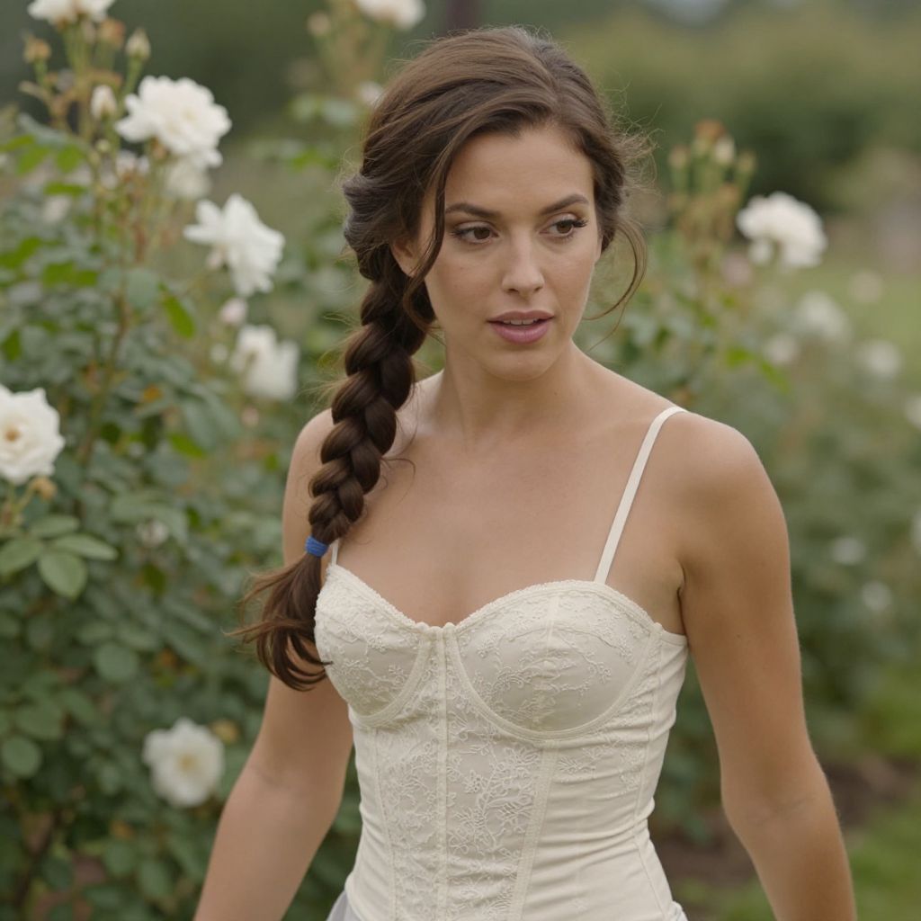 A well-lit, candid-style image of a woman with olive skin and braided brown hair, wearing a delicate cream bustier, stepping into a quiet garden with blooming white roses and soft green foliage in the background.