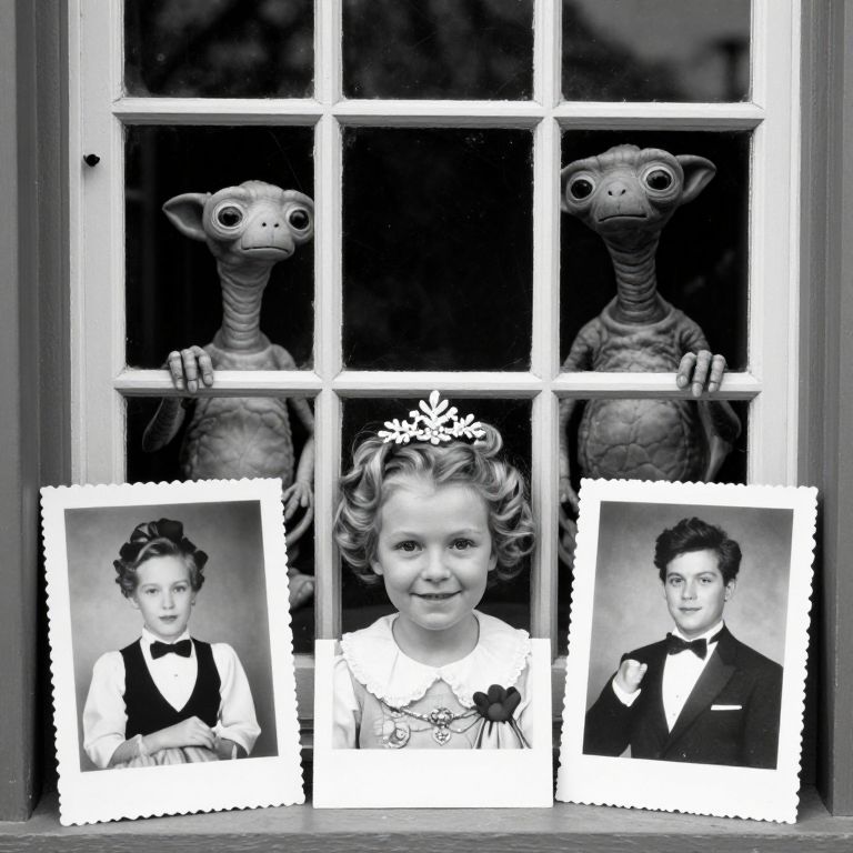The Queen Of Hearts old black and white family photos with E.T. looking in through the window in the background,