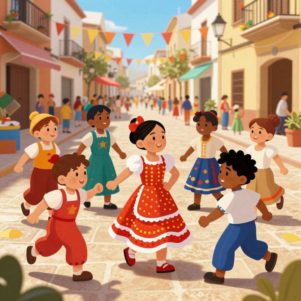 Freckles in Spanish theme, vibrant cultural illustration with children playing under the sun, showcasing diverse faces with charming freckles, traditional Spanish clothing, warm Mediterranean sunlight, lively street festival backdrop, colorful and joyful atmosphere