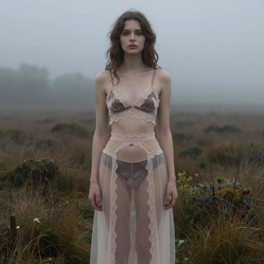 Image in the style of Surreal Fantasy, enigmatic wanderer, asymmetrical silver bob, slender androgynous, lingerie cut-out set, lace corset bralette, bevelled translucent panties, abstract cloudy backdrop studio background