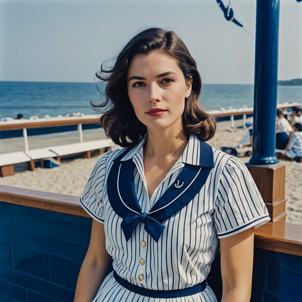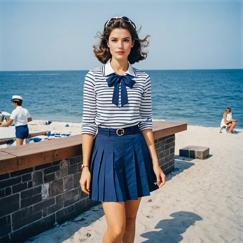 Photo of a S-Shaped woman, Beach Waves, sailor outfit, navy blue and white, sailor collar, striped shirt, pleated skirt, nautical theme, anchor motifs, Ultramarine Sea Island cotton, maritime style, classic, youthful, ballet flats, Outdoor bar, ektachrome film stock