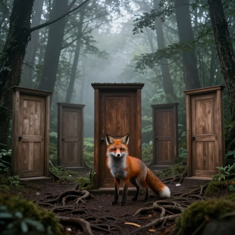 Silent forest whispers through foggy trees as a curious fox stands amidst five wooden doors, each portal suspended between earthy roots and ethereal light, inviting mystery and choice.