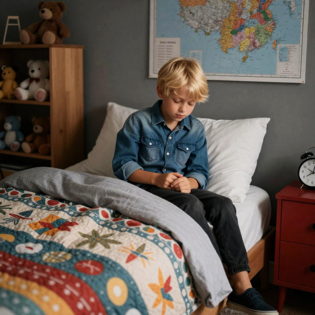 Blonde boy in bed, wearing denim shirt and dark pants, holding hands, eyes closed, under colorful quilt. Shelf with stuffed animals and toys on left. Clock on red nightstand on right. Map on wall above bed. Dim lighting.