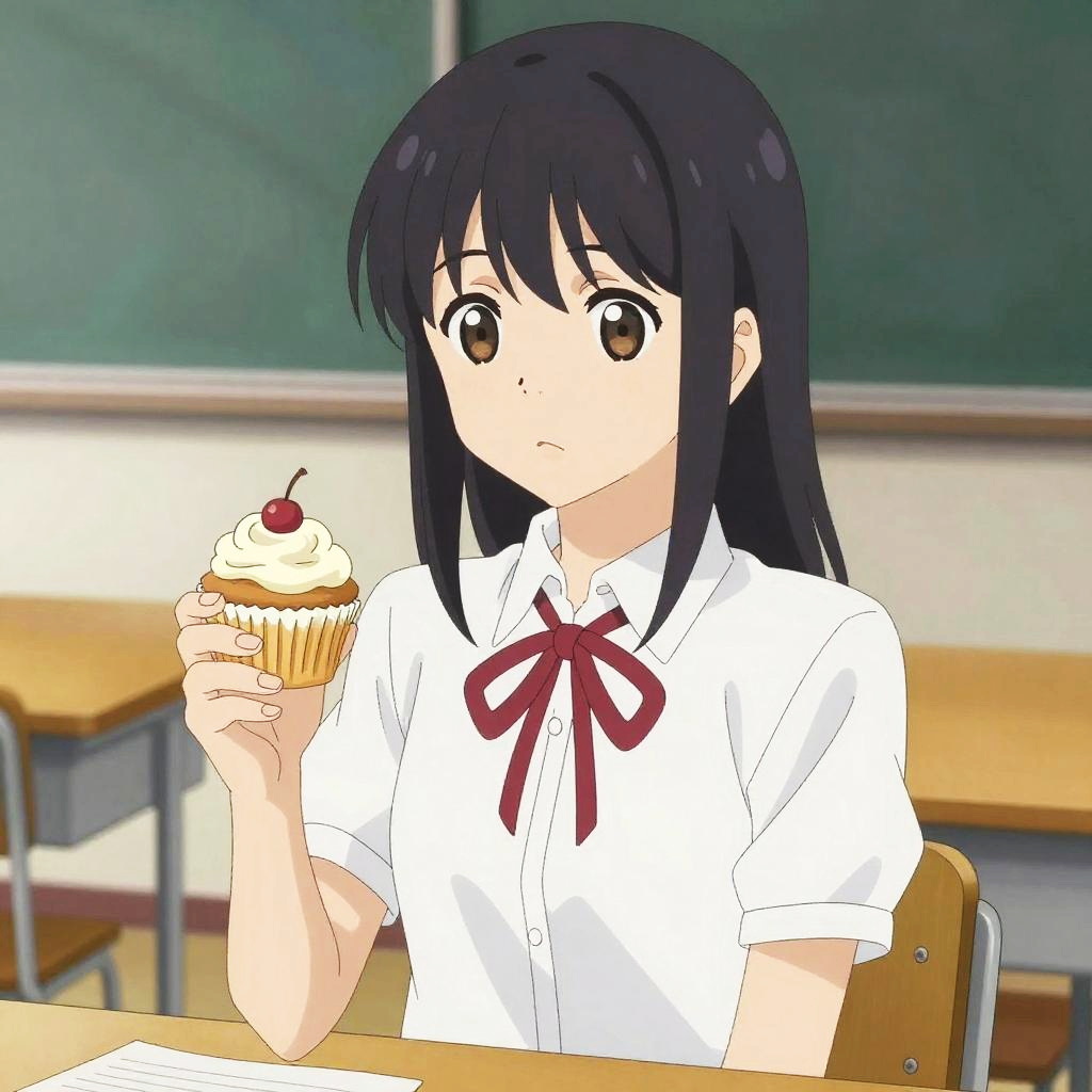 Anime-style digital drawing of a girl with long black hair with red tips, large purple eyes, and a maru-kei hairstyle, wearing a