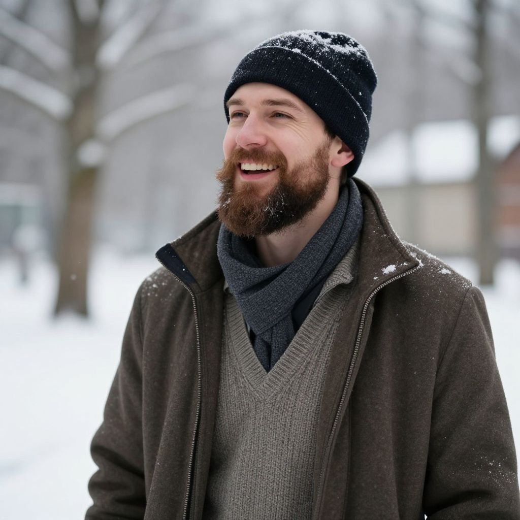 Embracing the warmth of laughter amidst the chill of winter, this bearded man radiates a joyful serenity, his layered attire symbolizing resilience and comfort in the face of nature’s transient cold.