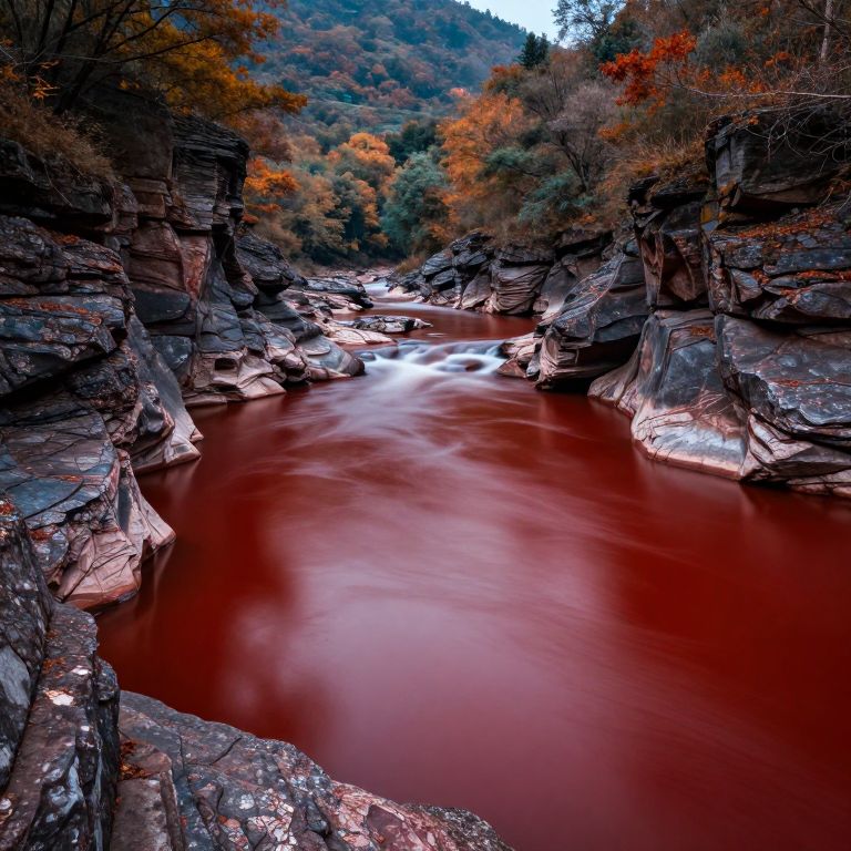 The image presents a breathtaking landscape through a reddish river, with intricate details and a rich color palette. The river, a vivid red, flows peacefully, reflecting the surrounding environment. The landscape is composed of rocky formations and trees with autumnal hues, creating a harmonious blend of warm and cool tones. The lighting is cinematic, with volumetric effects that enhance the depth and texture of the scene. The composition is balanced, with the river curving gracefully through the frame, and the rocks and trees arranged in a way that draws the viewer's eye through the image. The overall effect is one of photorealism, with super clear details and complex textures that make the scene appear almost tangible. The sharp focus and detailed HDR background further emphasize the richness of the colors and the intricate details of the landscape.