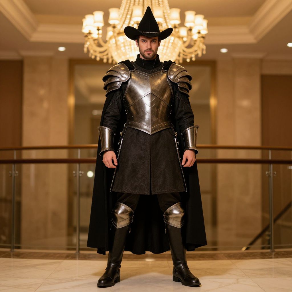 "magnificent costume adult, 1boy, solo, male focus, cape, standing, boots, hat, chandelier, indoors, mitre, full body, armor, facial hair Realistic photo of casual sexy person with pretty face"