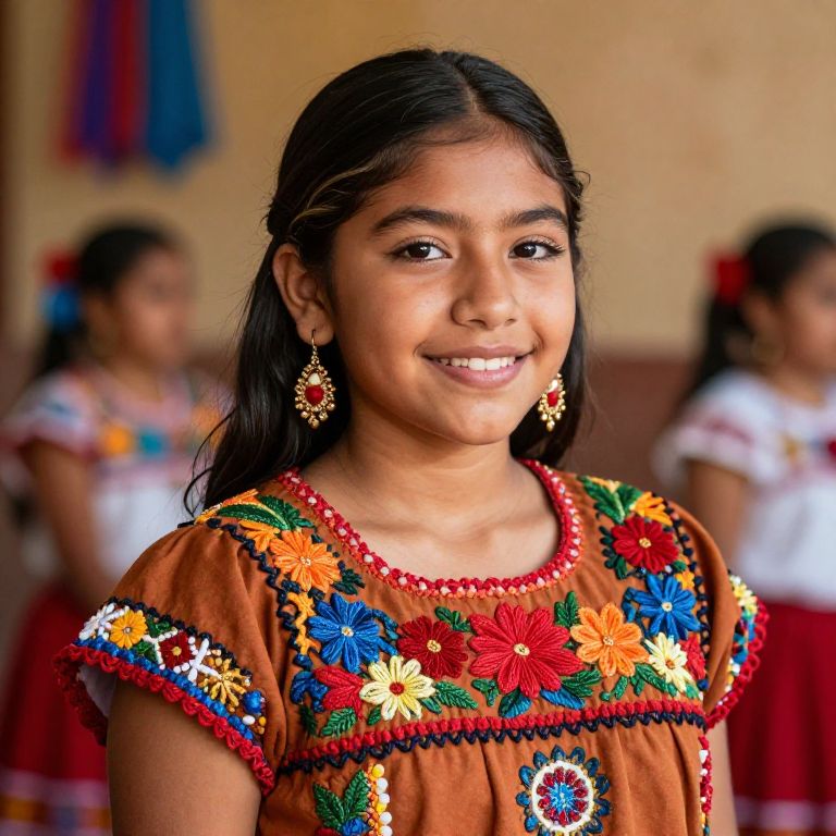 Mexican girl features highlighted in a vibrant portrait, warm earthy tones, traditional clothing with intricate embroidery, soft natural lighting, cultural celebration background