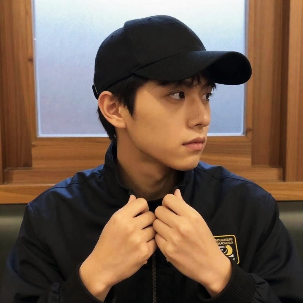 Close-up photograph of a young man with light brown, slightly messy hair wearing large headphones. His face is illuminated by a warm, reddish light, highlighting his focused expression. Dark background. Headphones on the left side of his head.