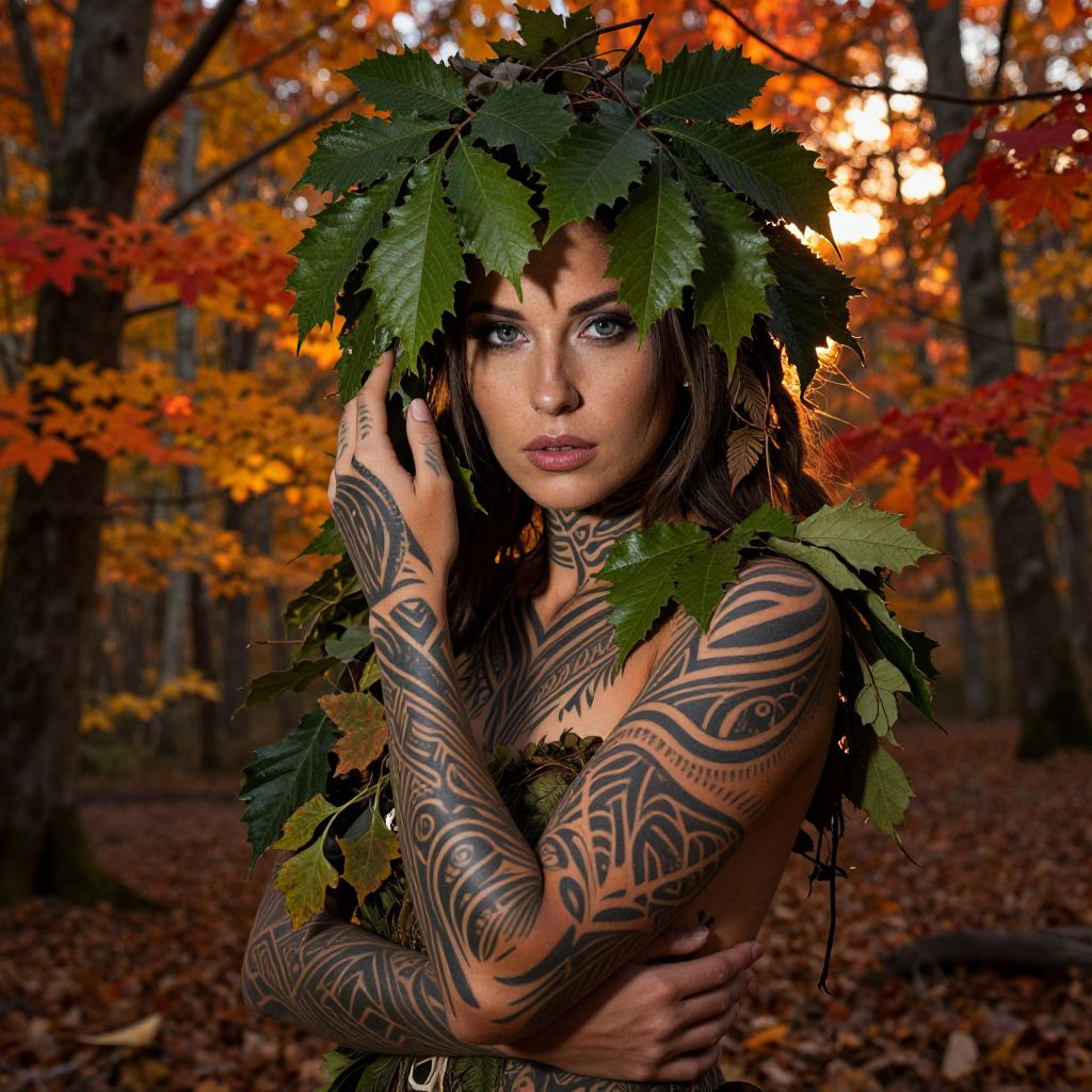 Enigmatic woman, late 20s, adorned with intricate tribal tattoos seamlessly merging into dense foliage. Her piercing eyes gleam from beneath a cascade of lush green leaves, exuding an air of mystery. The vibrant autumn forest landscape, with its oranges, reds, and yellows, intertwines harmoniously with her form, reflecting the rich earth tones of her skin and tattoos. Warm sunset glow casts long shadows, highlighting intricate details, emphasizing the profound connection between this human subject and the untamed wilderness that cradles her.
