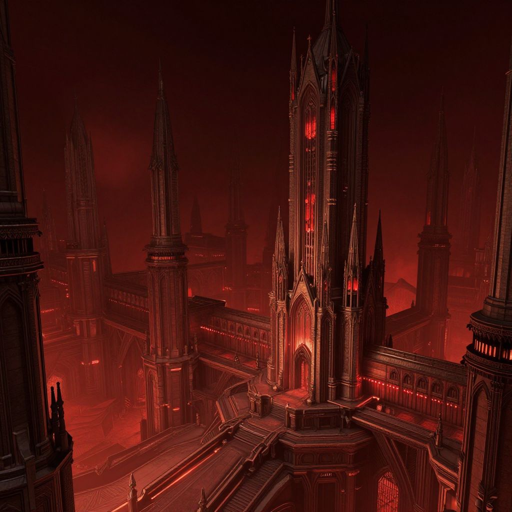 Digital artwork of a dark, gothic cathedral cityscape at night, bathed in eerie red light, with towering spires and intricate architecture.